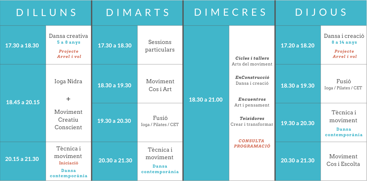 Les propostes indicades en aquesta graella d’horaris està destinada a un públic adult, exceptuant les caselles que indiquen Arrel i vol, destinades a infants i joves.